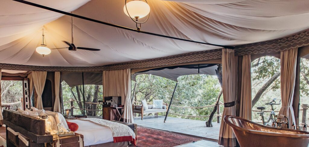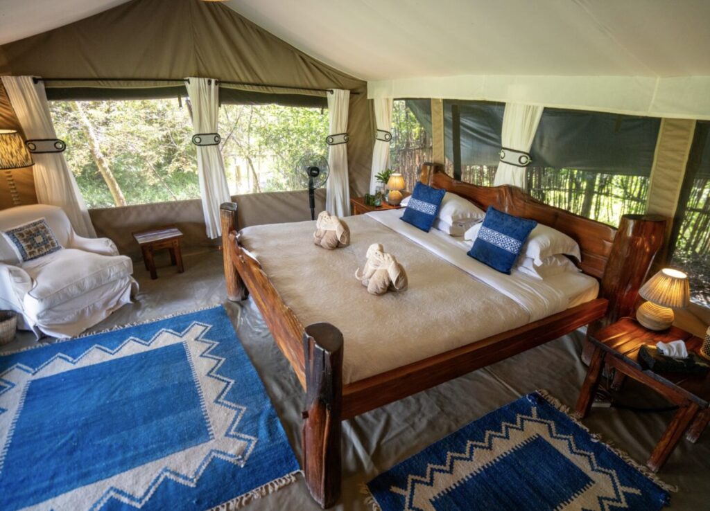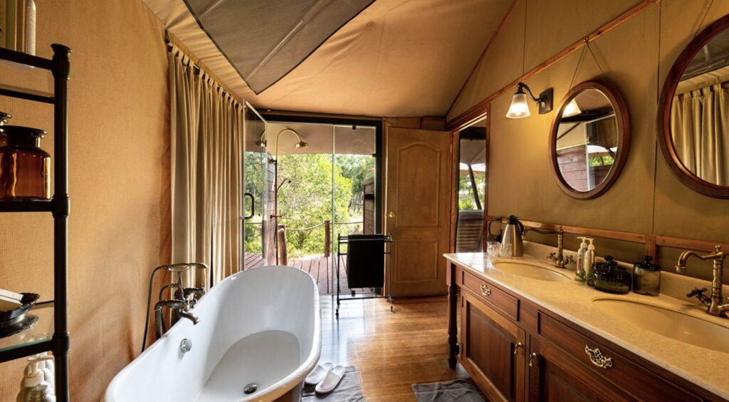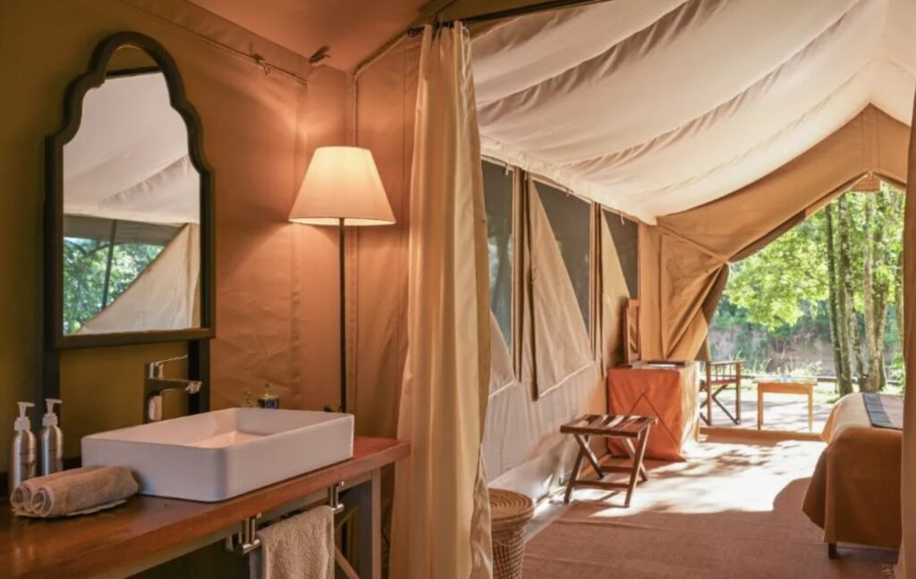 The entire camp is under canvas, with traditional safari tents overlooking the river and five family tents offering sweeping views of the plains. Each tent features an en-suite bathroom and private verandah. The camp also includes a riverside bar tent, a dining tent with panoramic views, and a spa tent offering natural treatments by The Wild Herb Company.